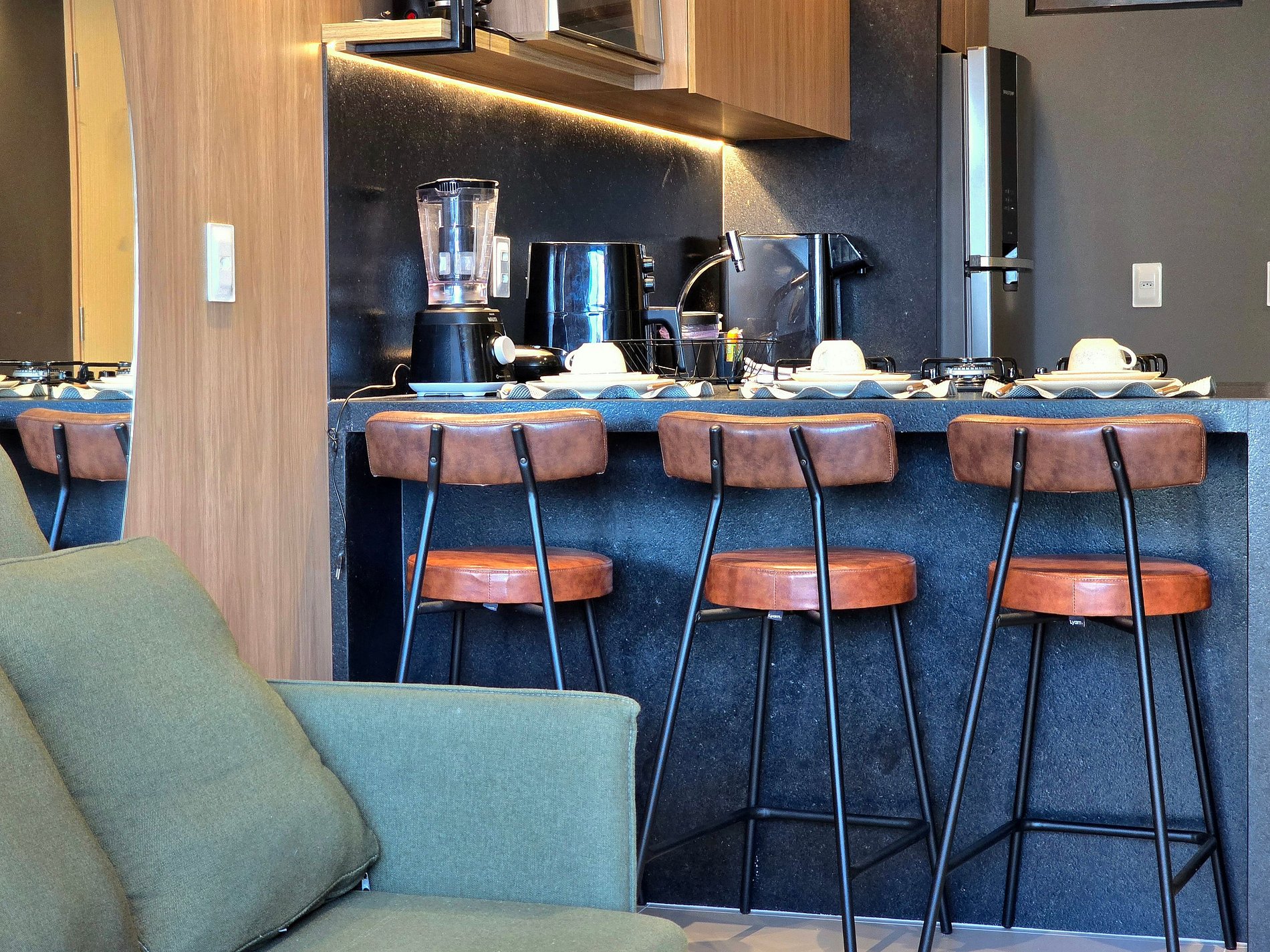 A sala climatizada convida a conversas demoradas no sofá confortável, ou quem sabe um filme na TV de tela generosa depois de um dia de sol. A cozinha americana completa, com air fryer, liquidificador, cafeteira e utensílios, atende desde o café da manhã despretensioso até um jantar especial.
