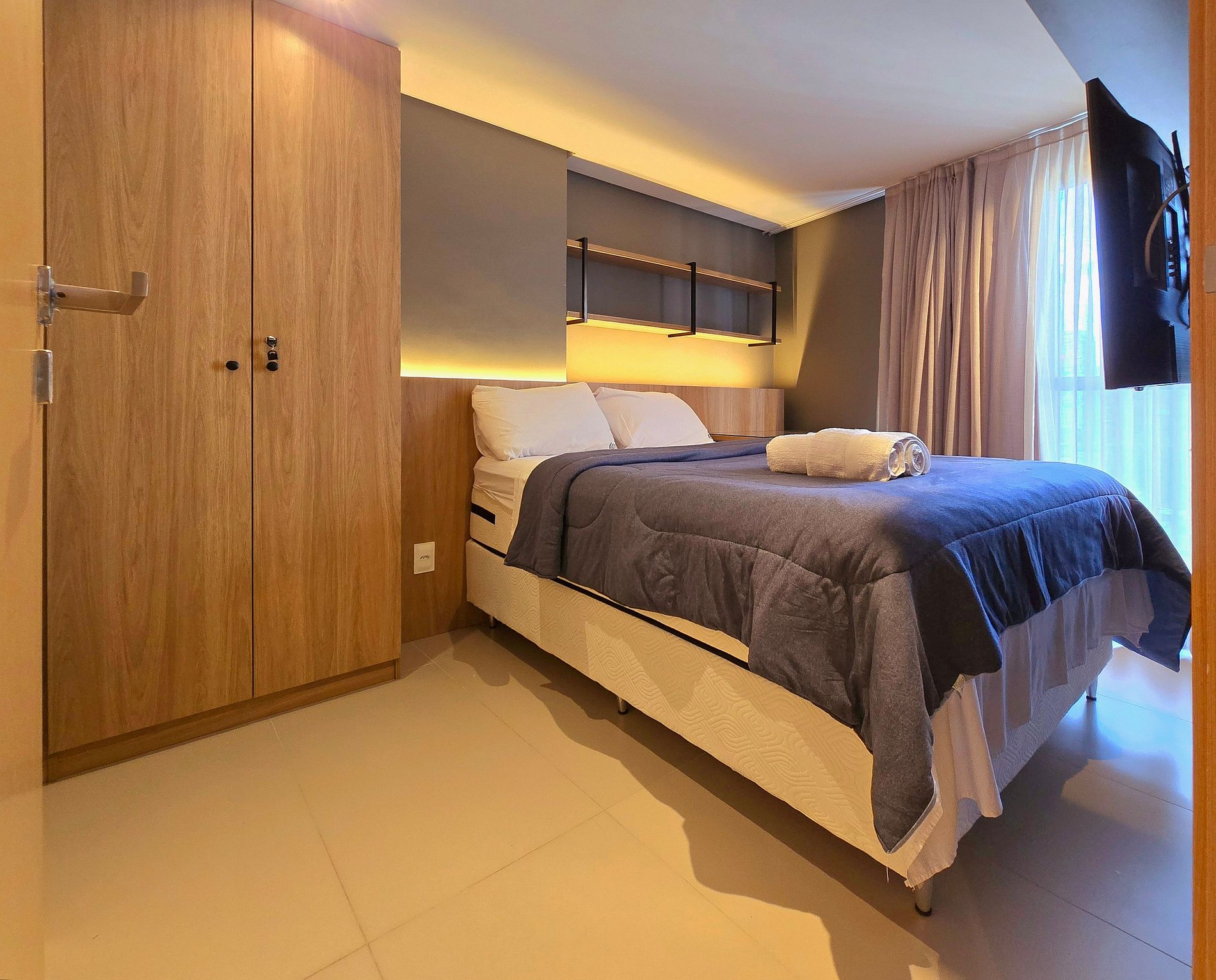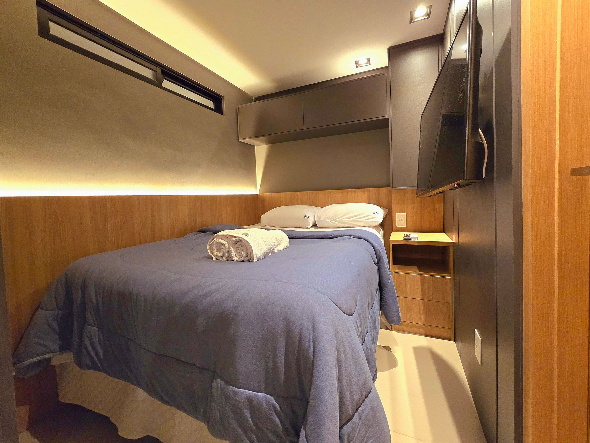 Na suíte principal, o descanso ganha cenário: cama de casal, ar-condicionado, TV e uma varanda. A suíte reversível garante privacidade extra e conforto, também climatizada e com TV.