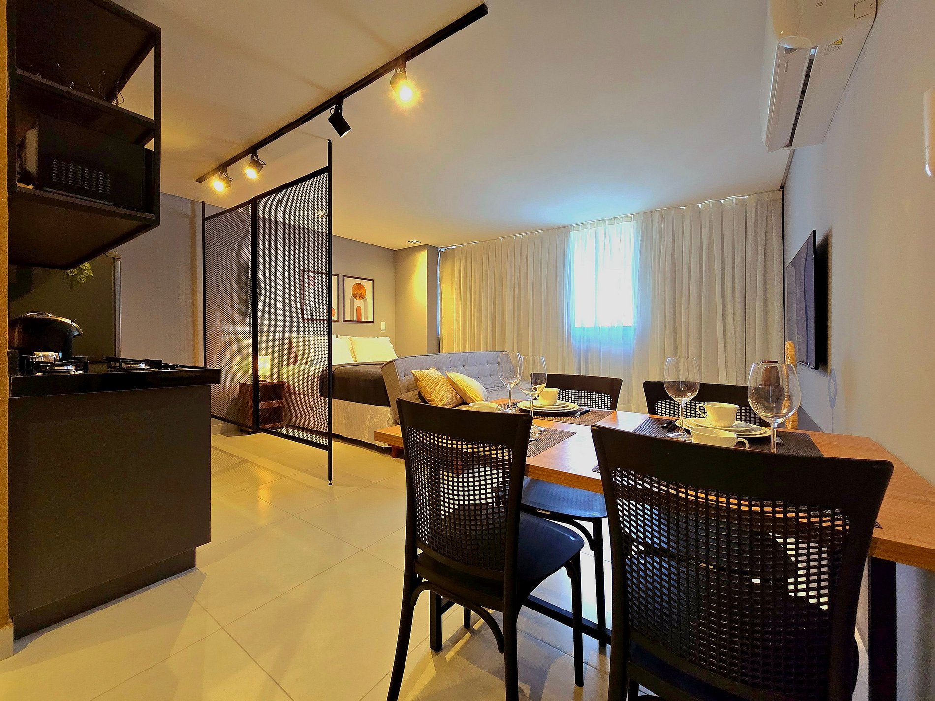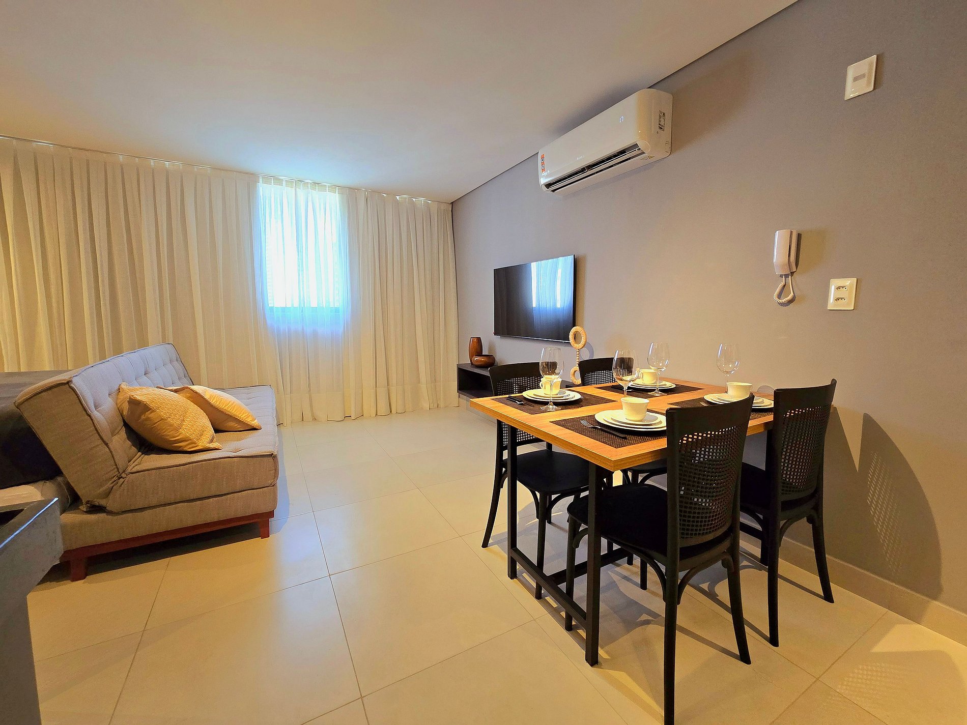 Lá dentro, o apartamento acomoda até quatro pessoas com facilidade. A cama de casal e o sofá-cama oferecem noites tranquilas. A cortina blackout garante o descanso. O ar-condicionado refresca o ambiente. Na cozinha, tudo está à mão: geladeira, micro-ondas, fogão, air fryer, sanduicheira, liquidificador, cafeteira Três Corações, pratos, copos, talheres e utensílios.