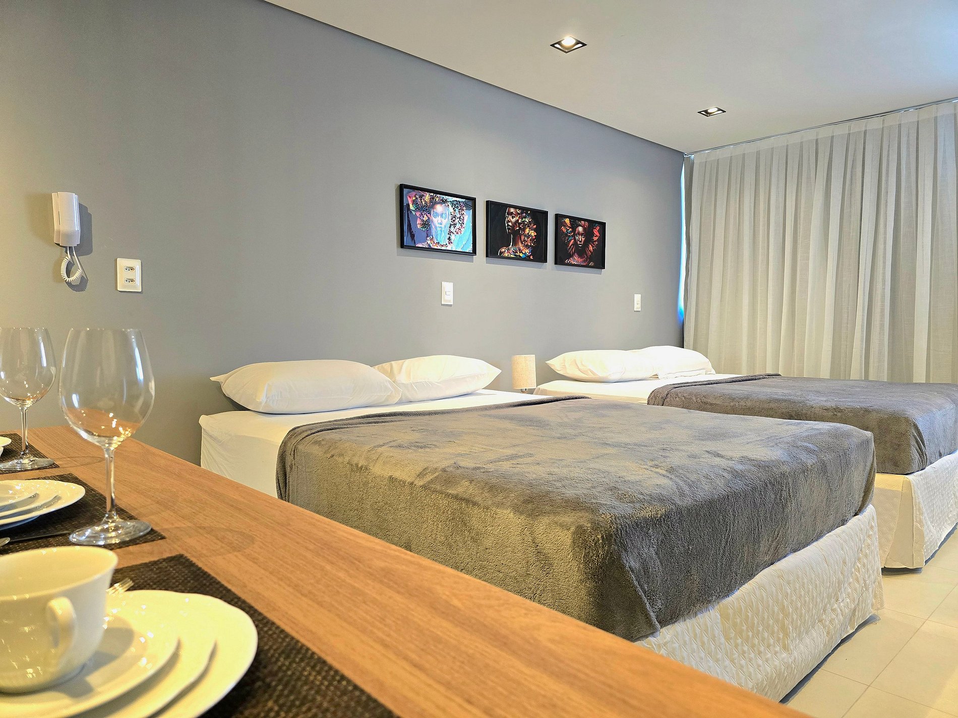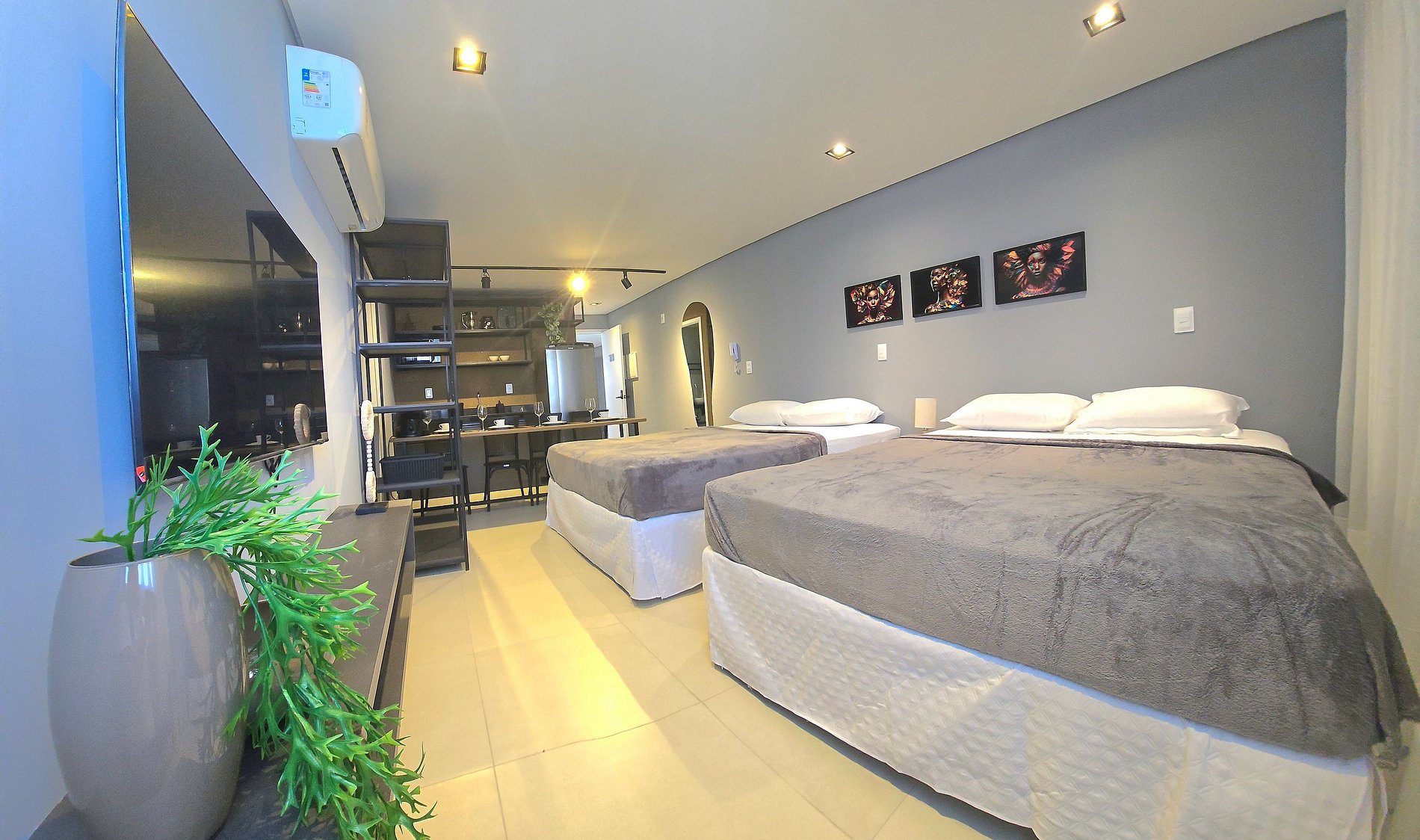 Com duas camas de casal bem dispostas, o flat é ideal para dois casais, uma família pequena ou quem valoriza espaço para relaxar. A cortina blackout proporciona noites mais tranquilas, enquanto o ar-condicionado garante o clima ideal o tempo todo. A decoração simples e funcional contribui para uma estadia sem excessos, mas cheia de cuidado.