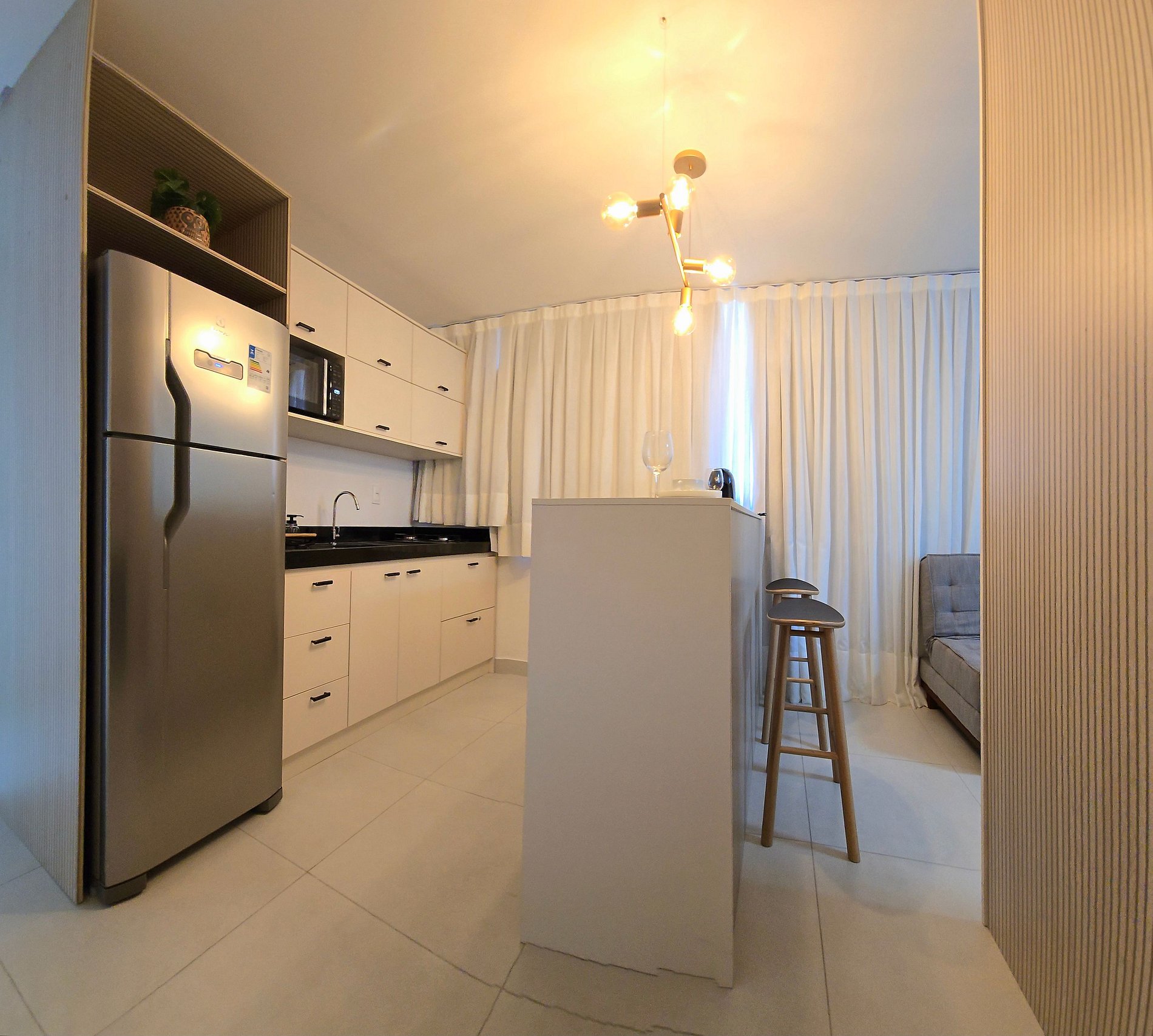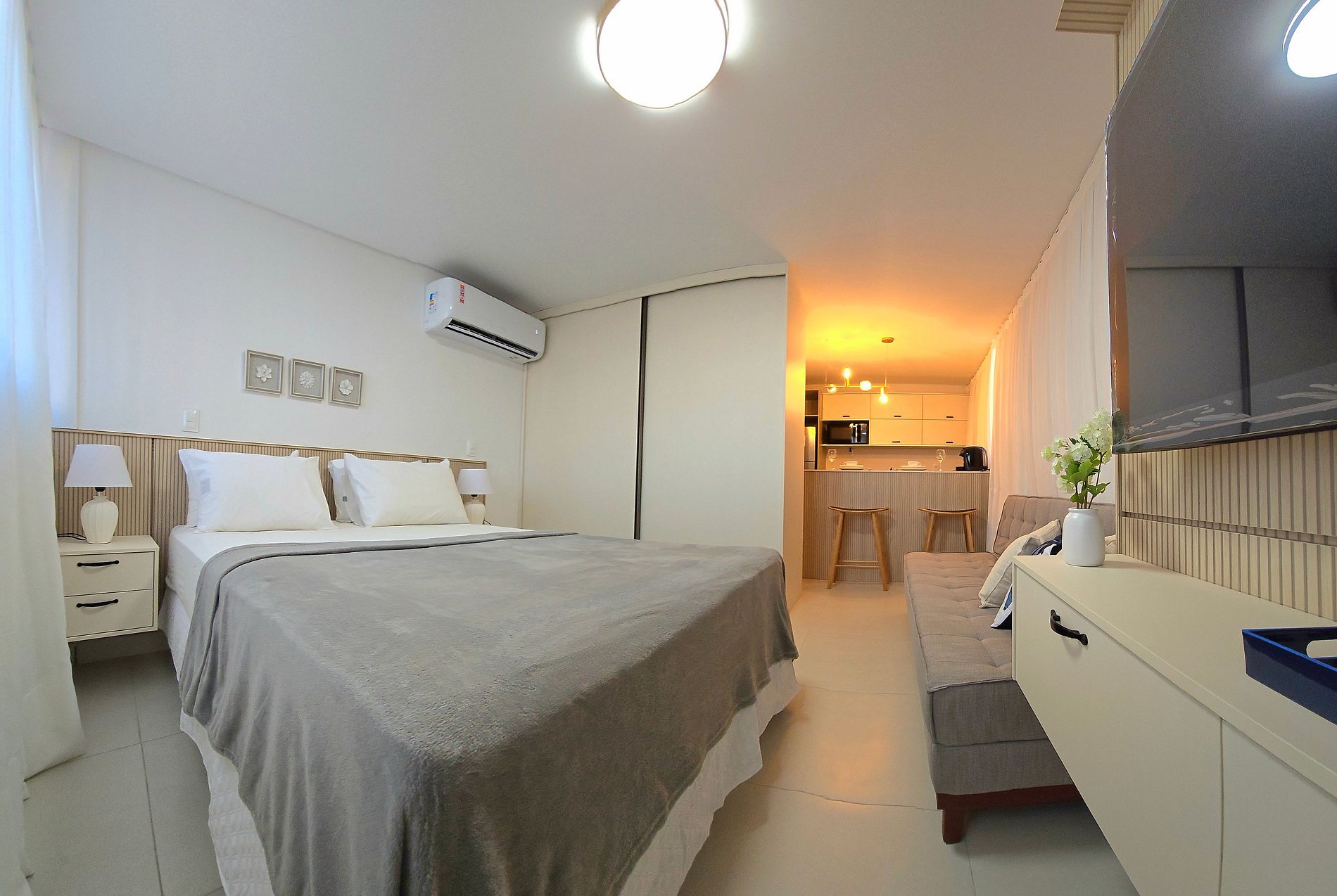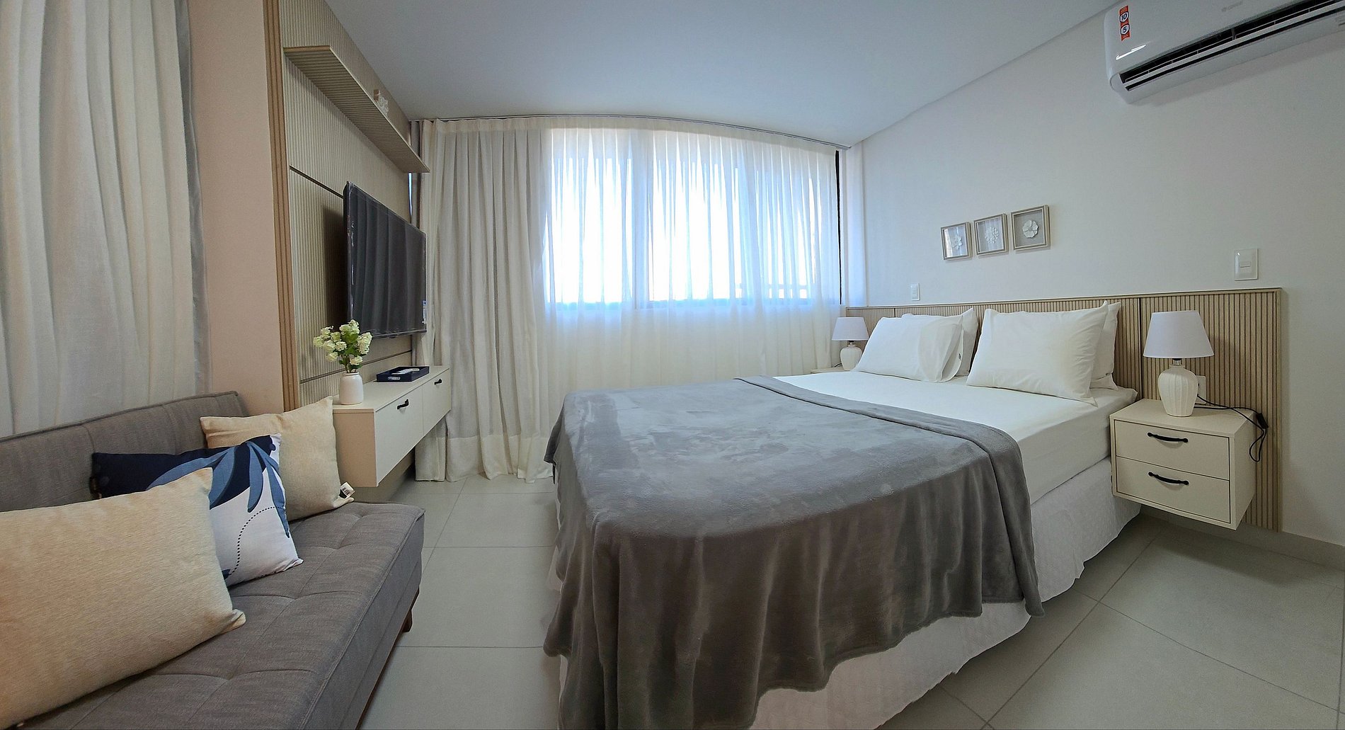 A rotina se adapta facilmente aqui: blackout para noites bem dormidas, ar-condicionado para o clima certo, cama de casal confortável e um sofá-cama que acomoda com praticidade. A cozinha equipada — com geladeira, fogão, micro-ondas, air fryer, sanduicheira, cafeteira Três Corações, liquidificador, pratos e talheres — transforma o dia a dia em pequenos rituais.
