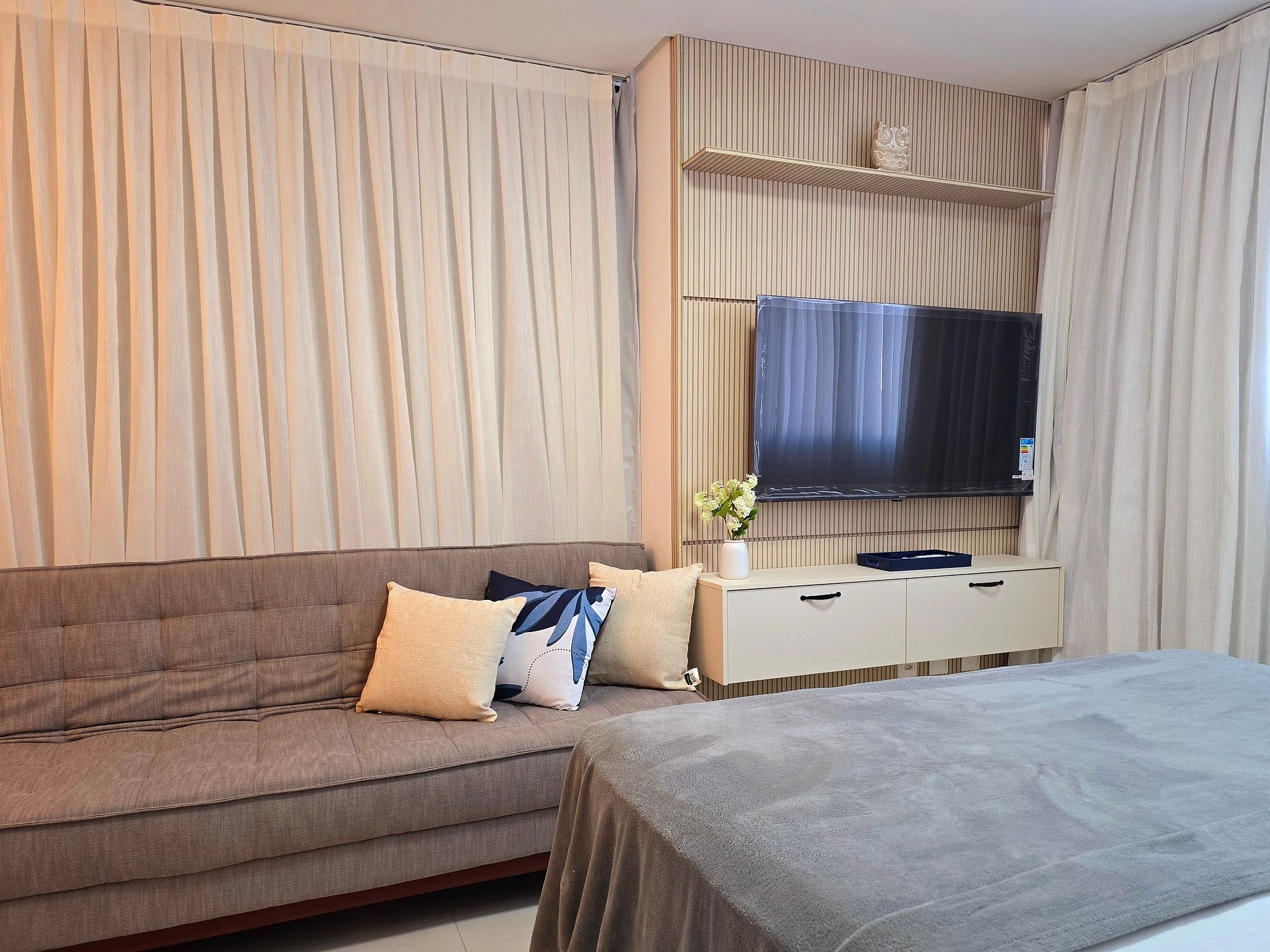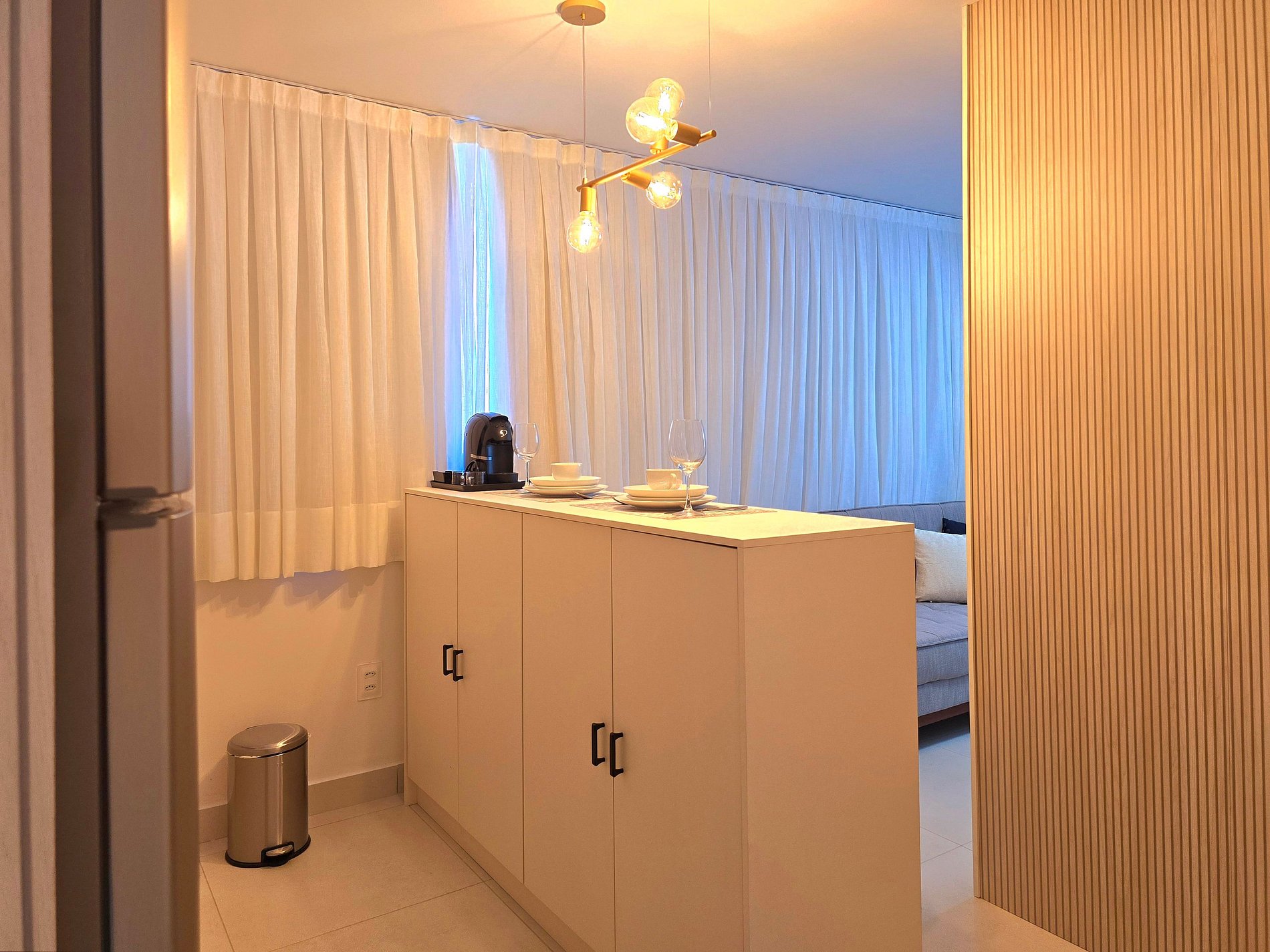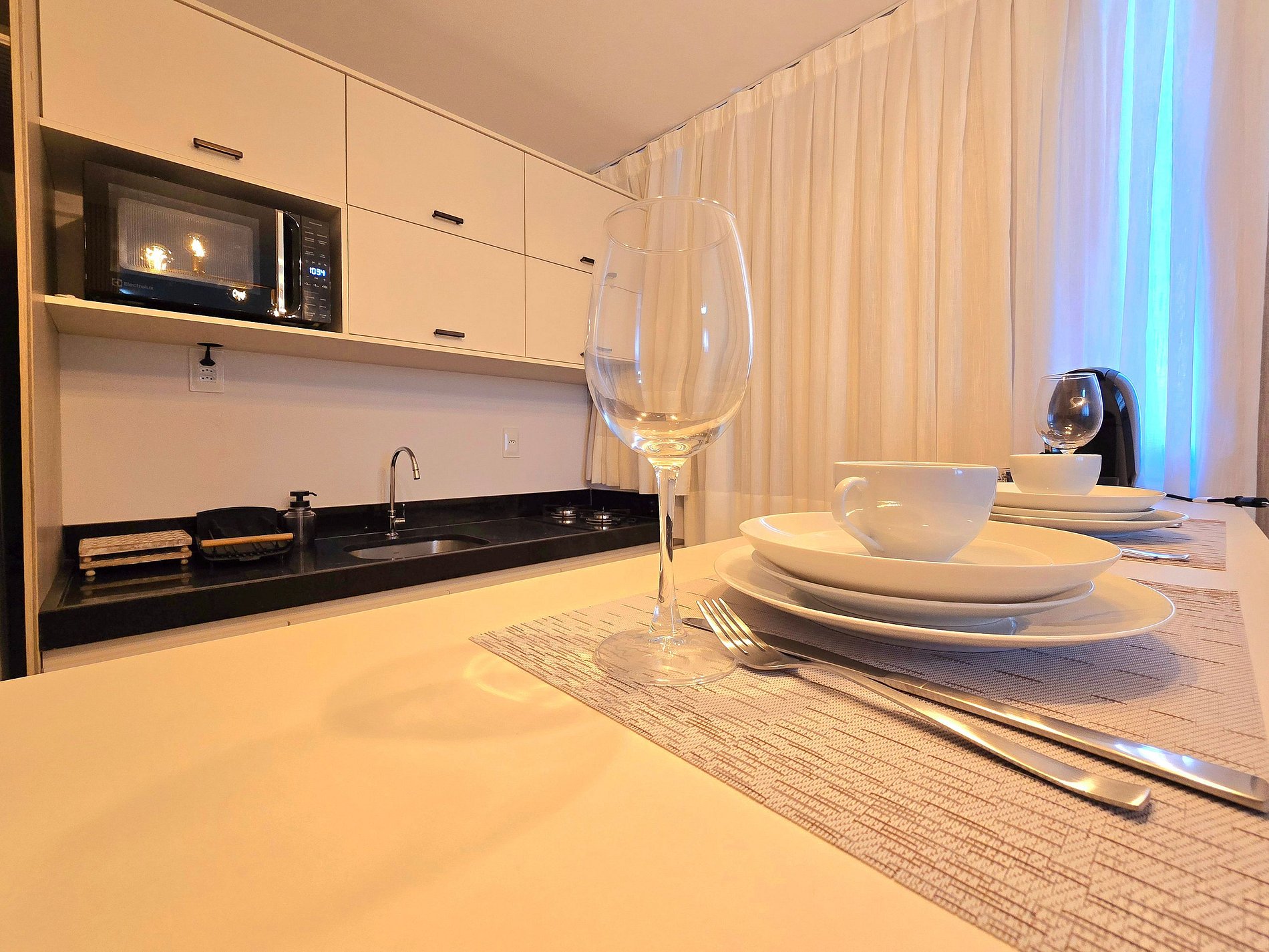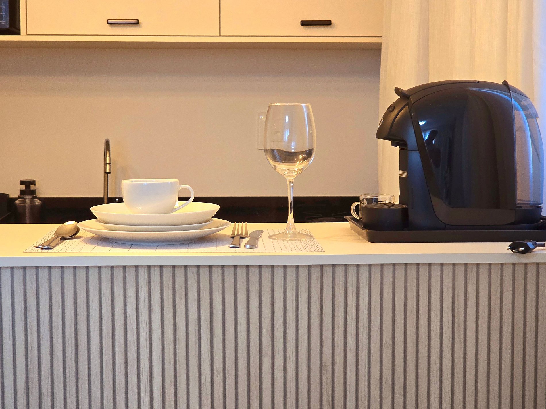 A rotina se adapta facilmente aqui: blackout para noites bem dormidas, ar-condicionado para o clima certo, cama de casal confortável e um sofá-cama que acomoda com praticidade. A cozinha equipada — com geladeira, fogão, micro-ondas, air fryer, sanduicheira, cafeteira Três Corações, liquidificador, pratos e talheres — transforma o dia a dia em pequenos rituais.