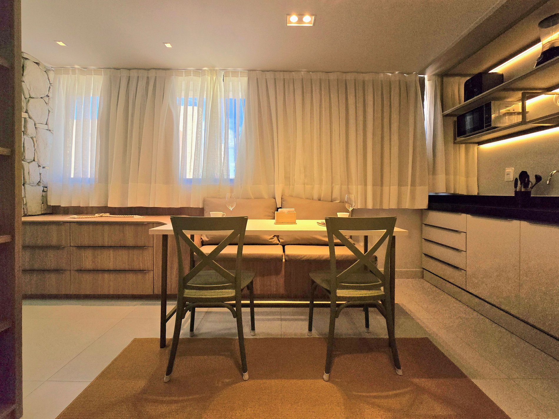 O espaço é bem distribuído em dois ambientes: um com cama de casal aconchegante, blackout e ar-condicionado; outro com sofá-cama e mesa de jantar, ideal para refeições tranquilas e noites bem acomodadas — recebe até quatro pessoas com conforto.