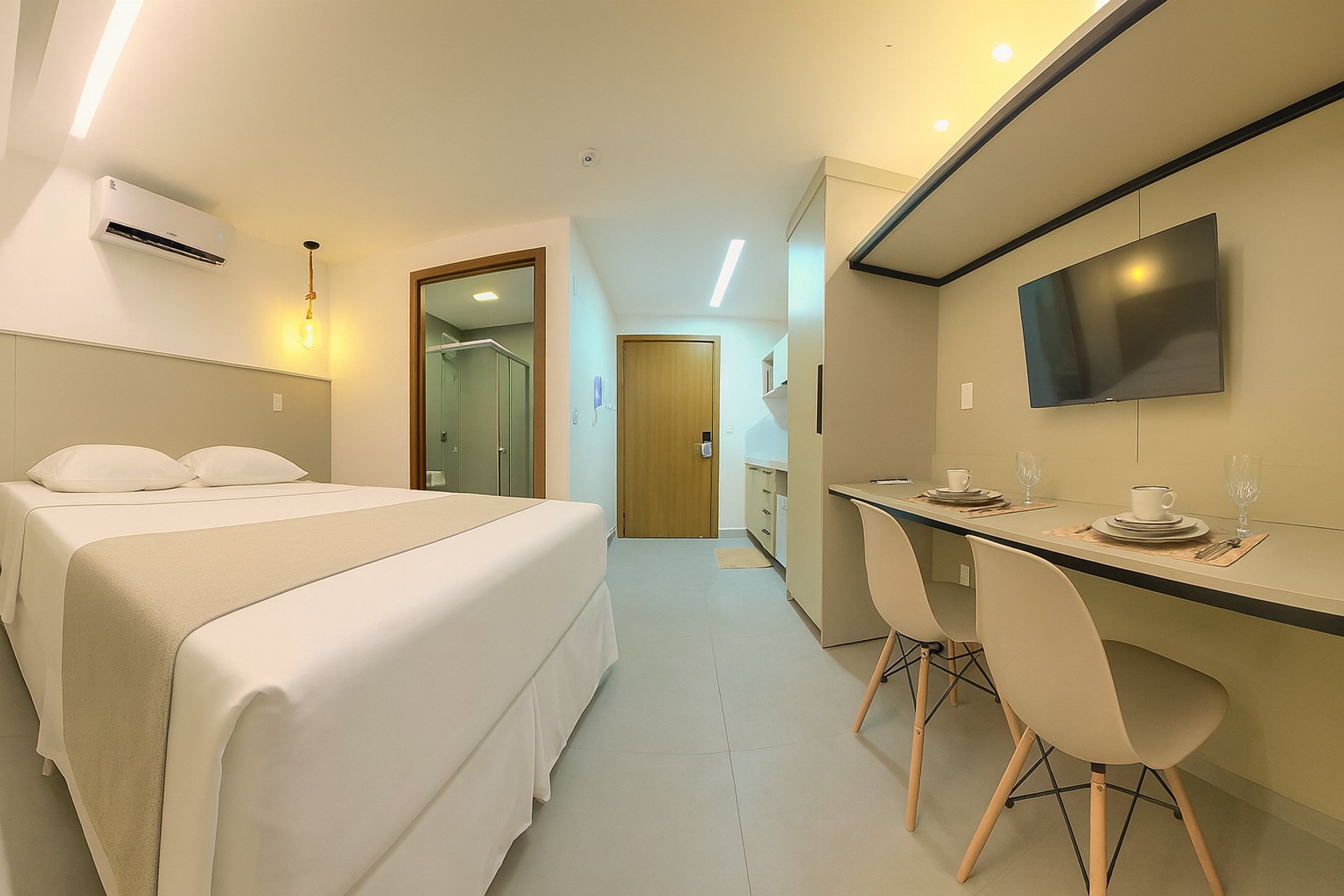Tudo dentro do espaço é pensado para acolher com praticidade e conforto. A cama de casal repousa sob um ambiente bem iluminado, com blackout quando for hora de descansar. A mini-cozinha surpreende pela funcionalidade: frigobar, fogão, micro-ondas, sanduicheira, liquidificador e utensílios que tornam fácil preparar refeções rápidas após o banho de mar.