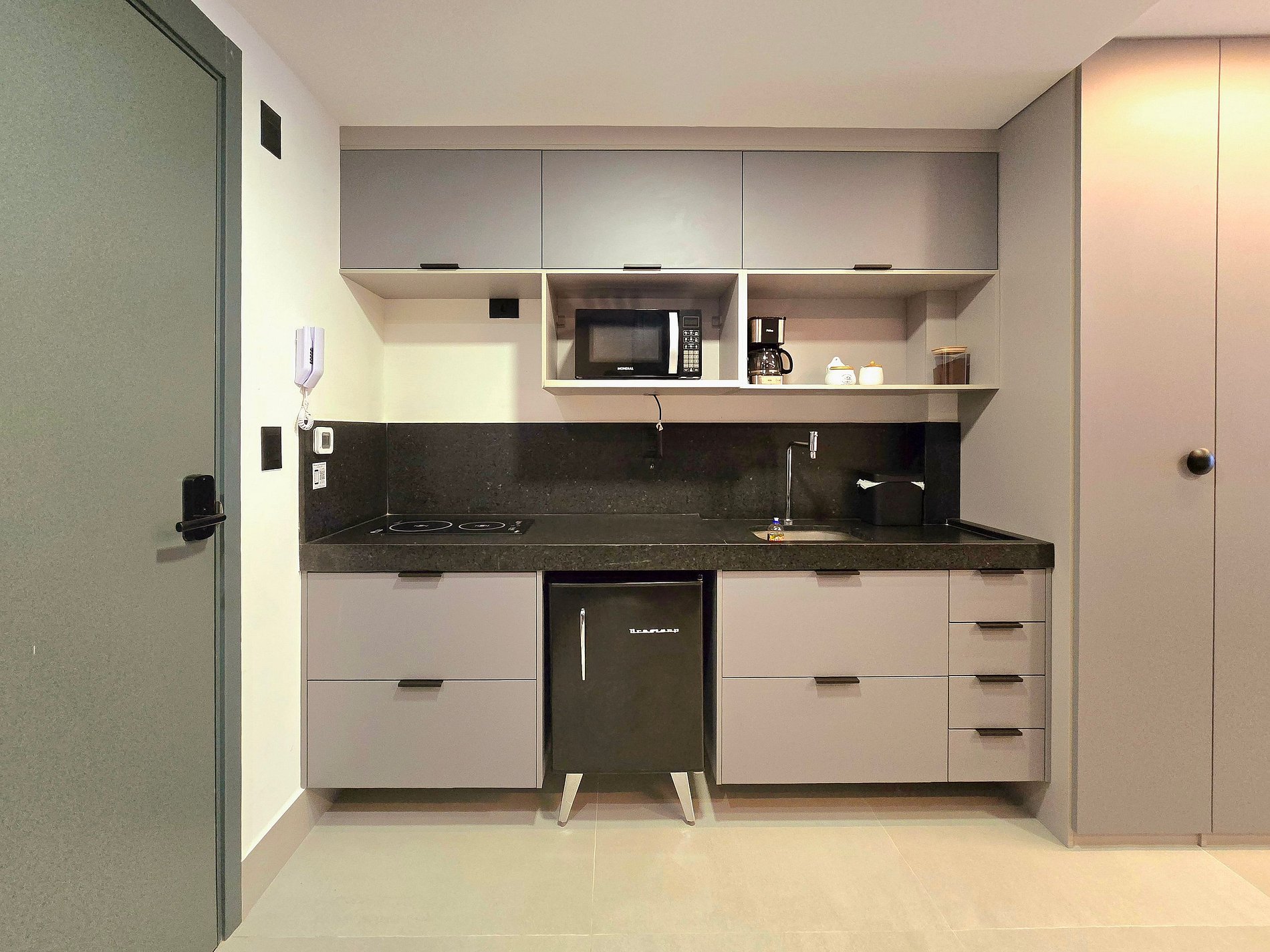 Cozinha prática com: frigobar, fogão, micro-ondas, cafeteira, pratos, liquidificador, sanduicheira, copos e talheres
