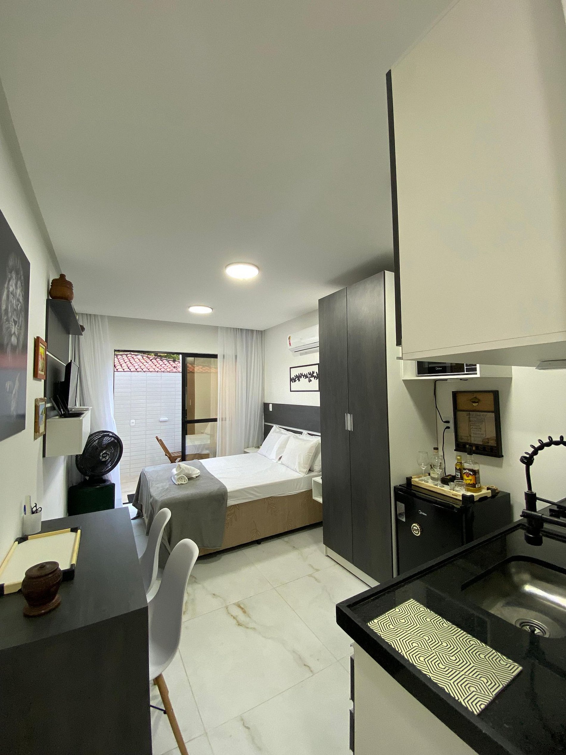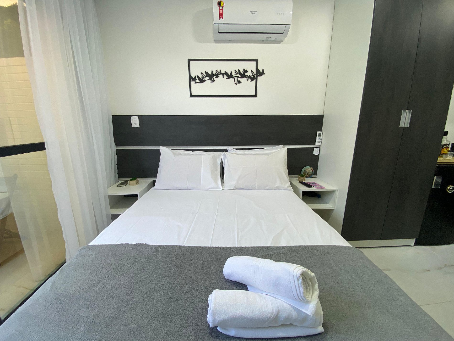 Nosso flat foi projetado com o seu conforto em mente. A unidade oferece uma cama casal, ideal para uma noite de descanso tranquila. Aceitamos pets, para que você possa trazer seu amigo de quatro patas para compartilhar essa experiência conosco.