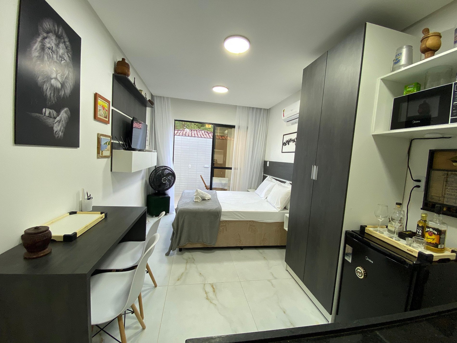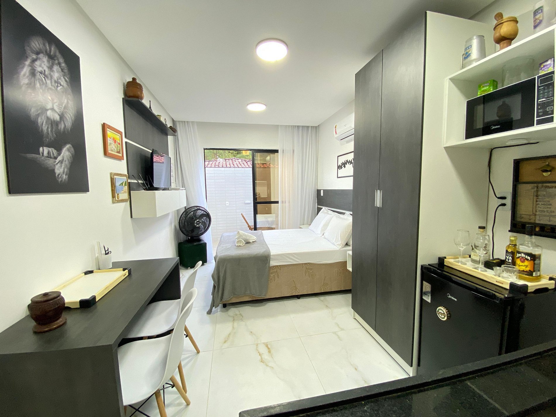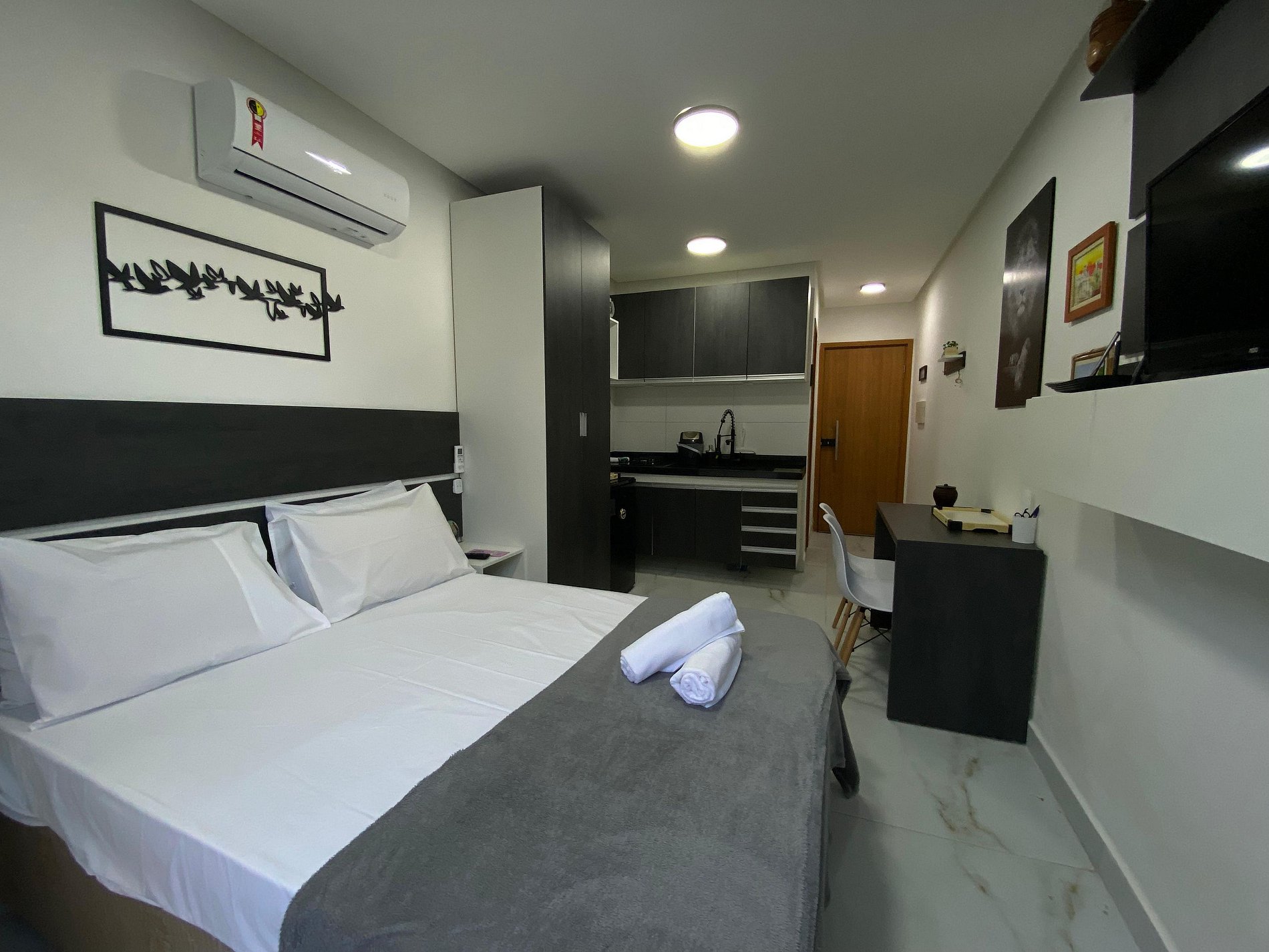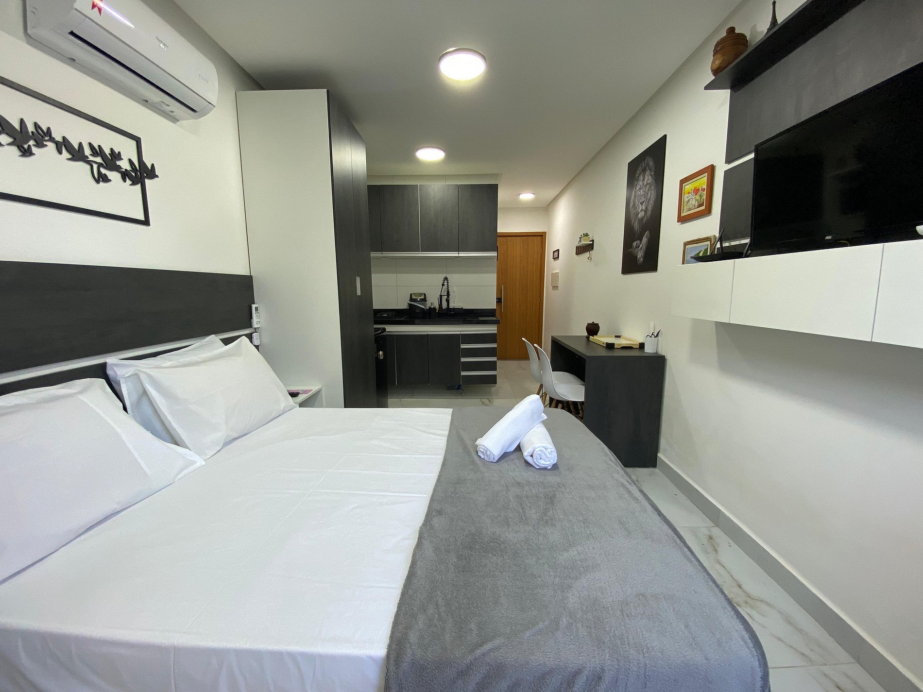 Comodidades: Aprecie o seu programa de TV favorito na nossa TV smart de 32 polegadas ou relaxe em um ambiente com ar-condicionado após um dia sob o sol. As janelas contam com cortinas blackout para garantir noites de sono tranquilas. A Alexa traz um toque de tecnologia para o flat.