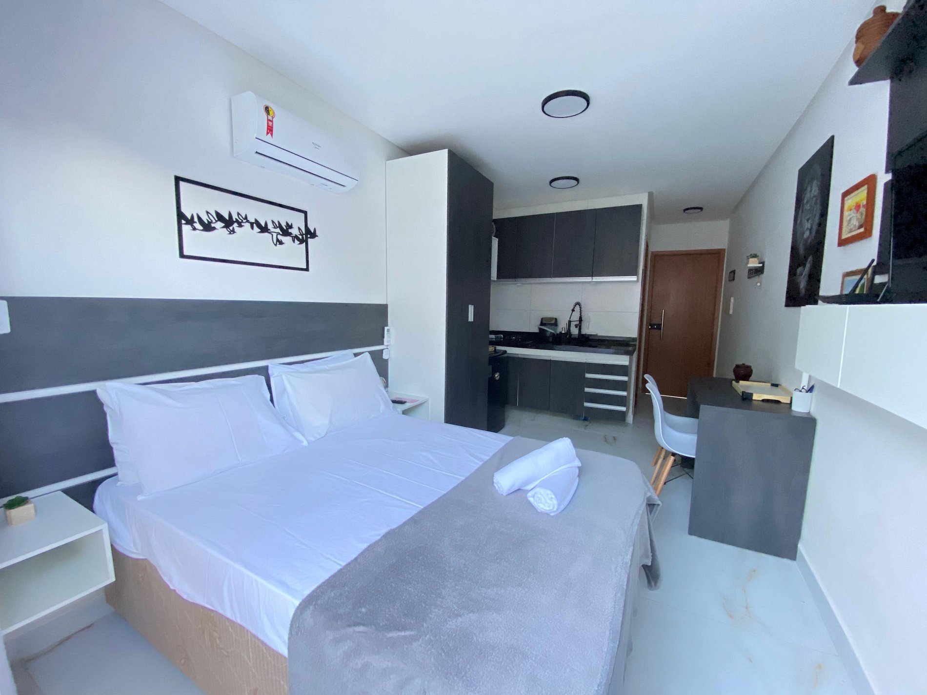 Nosso flat foi projetado com o seu conforto em mente. A unidade oferece uma cama casal, ideal para uma noite de descanso tranquila. Aceitamos pets, para que você possa trazer seu amigo de quatro patas para compartilhar essa experiência conosco.